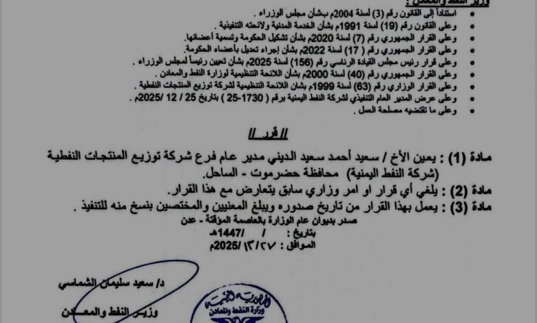 وصدر القرار بديوان عام وزارة النفط والمعادن في العاصمة المؤقتة عدن