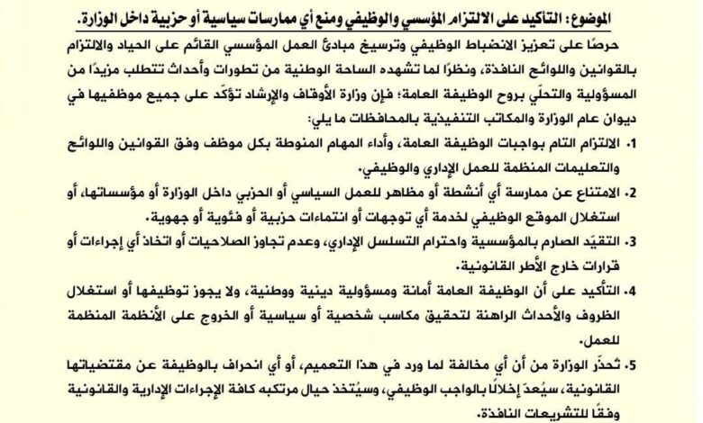 وأكد التعميم، الموجه إلى كافة موظفي الوزارة، الامتناع عن ممارسة أو إظهار أي أنشطة أو توجهات سياسية أو حزبية داخل بيئة العمل أو استغلال الوظيفة العامة لخدمة أي أجندات شخصية أو فئوية، مع ضرورة احترام التسلسل الإداري وعدم تجاوز الصلاحيات أو اتخاذ أي قرارات خارج الأطر القانونية المعتمدة.