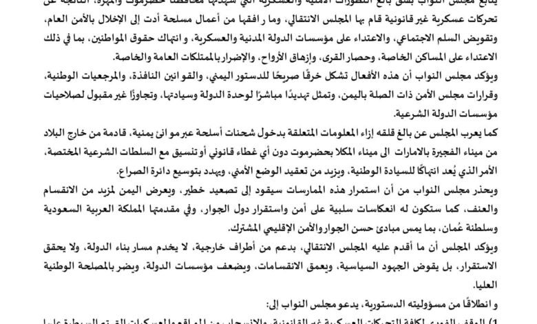 وثمّن مجلس النواب عاليًا المواقف الأخوية والتاريخية للمملكة العربية السعودية، مشيدًا بجهودها المستمرة لخفض التصعيد، والدعوة إلى التهدئة، والحفاظ على استقرار اليمن وأمن جواره الإقليمي، مؤكدًا أهمية تغليب لغة العقل والحوار، وتجنب أي إجراءات من شأنها تعقيد المشهد أو الإضرار بالمصلحة الوطنية