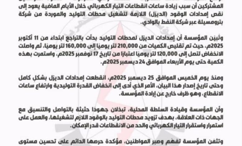 كما أكدت الشركة استمرارها في متابعة الوضع عن كثب، مع السعي لتأمين البدائل اللازمة لضمان استمرارية الخدمة وتحسين موثوقية الشبكة الكهربائية في وادي حضرموت.