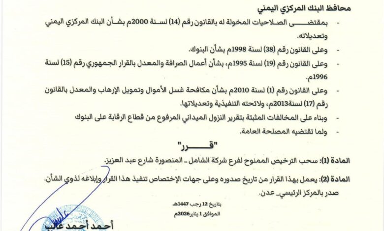 كما أصدر المحافظ القرار رقم (2) لسنة 2026م، القاضي بسحب ترخيص فرع شركة الشامل للصرافة، الكائن في مديرية المنصورة – شارع عبدالعزيز، والعمل بموجبه من تاريخ صدوره، مع إلزام الجهات المختصة بتنفيذ القرار وإبلاغ ذوي الشأن.