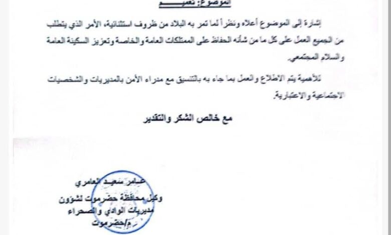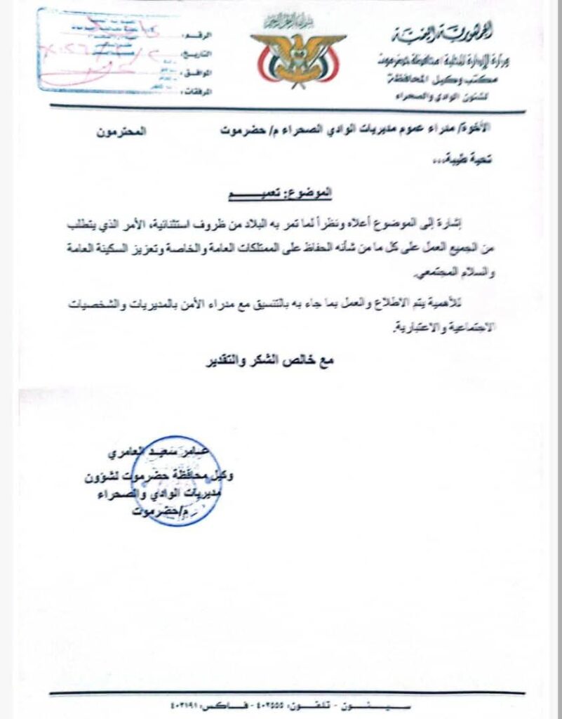 وجّه وكيل محافظة حضرموت لشؤون مديريات الوادي والصحراء، الأستاذ عامر سعيد العامري، مدراء عموم المديريات باتخاذ كافة الإجراءات اللازمة للحفاظ على الممتلكات العامة والخاصة، وتعزيز السكينة العامة وترسيخ التعايش المجتمعي، بما يسهم في استقرار الأوضاع في مديريات الوادي والصحراء.