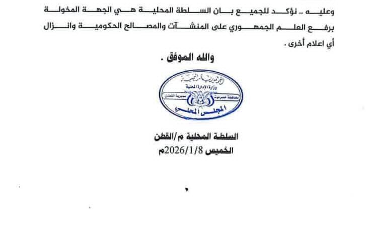 وأكدت السلطة المحلية أن الجهة المخولة قانونًا برفع العلم الجمهوري على المنشآت والمصالح الحكومية، وإنزال أي أعلام أخرى، هي السلطة المحلية فقط، وذلك وفقًا للصلاحيات القانونية والإدارية النافذة.