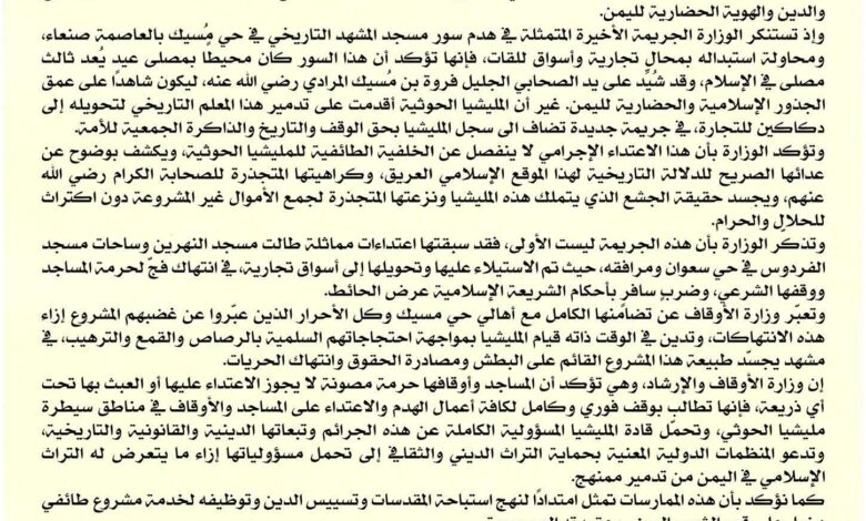 وأكد البيان أن هذا الاعتداء يأتي في سياق نهج ممنهج تنتهجه المليشيا الحوثية، نابع من خلفيات طائفية وعداء واضح للرموز الإسلامية والتاريخية، وسعي محموم لجمع الأموال بطرق غير مشروعة دون أي اعتبار لقدسية الوقف أو أحكام الشريعة الإسلامية.