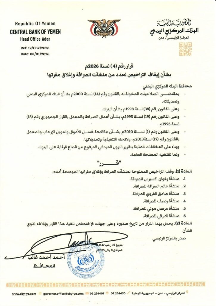 كما أصدر البنك المركزي القرار رقم (4) لسنة 2026م، بشأن إيقاف تراخيص عدد من منشآت الصرافة وإغلاق مقراتها، شملت منشآت: إكسبريس للصرافة، عالم الصرافة، صادق الفوري للصرافة، رضيف للصرافة، مرسال موني للصرافة، والأريقي للصرافة، وذلك للمخالفات ذاتها وبما تقتضيه المصلحة العامة.