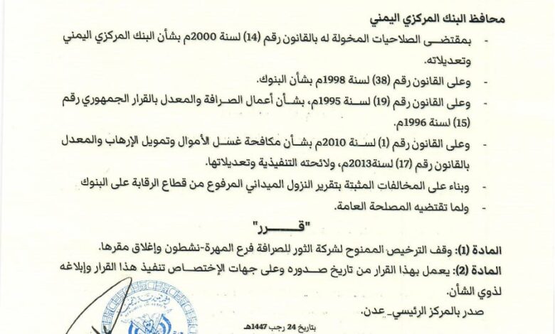 وشملت القرارات القرار رقم (6) لسنة 2026م، القاضي بإيقاف ترخيص شركة الثور للصرافة – فرع المهرة (نشطون) وإغلاق مقرها، استنادًا إلى الصلاحيات المخولة لمحافظ البنك المركزي اليمني، وبموجب القوانين النافذة المتعلقة بالبنك المركزي، والبنوك، وأعمال الصرافة، ومكافحة غسل الأموال وتمويل الإرهاب، وبناءً على تقارير النزول الميداني الصادرة عن قطاع الرقابة على البنوك.